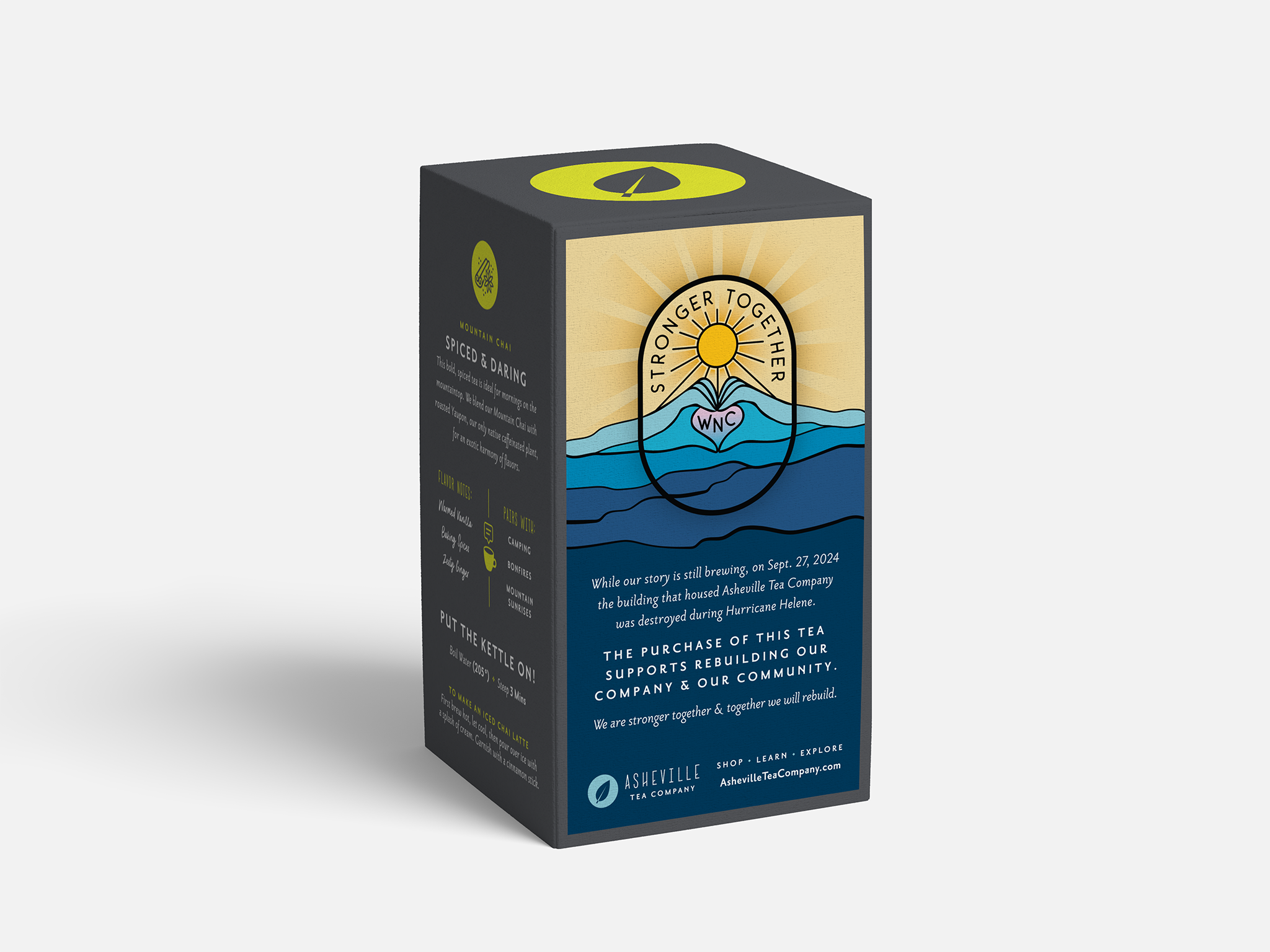 This bold, spiced tea is ideal for those mornings on the mountaintop. We blend our Mountain Chai with yaupon, our only native caffeinated plant, for an exotic harmony of flavors. Serve hot & steamy or chilled over ice with a splash of cream for an out of this world iced chai latte. Packaging Details: Recycled boxes with 20 biodegradable, plastic-free tea bags (1.5 oz). Black tea, roasted yaupon, ginger, cinnamon, cardamom, cloves, black pepper