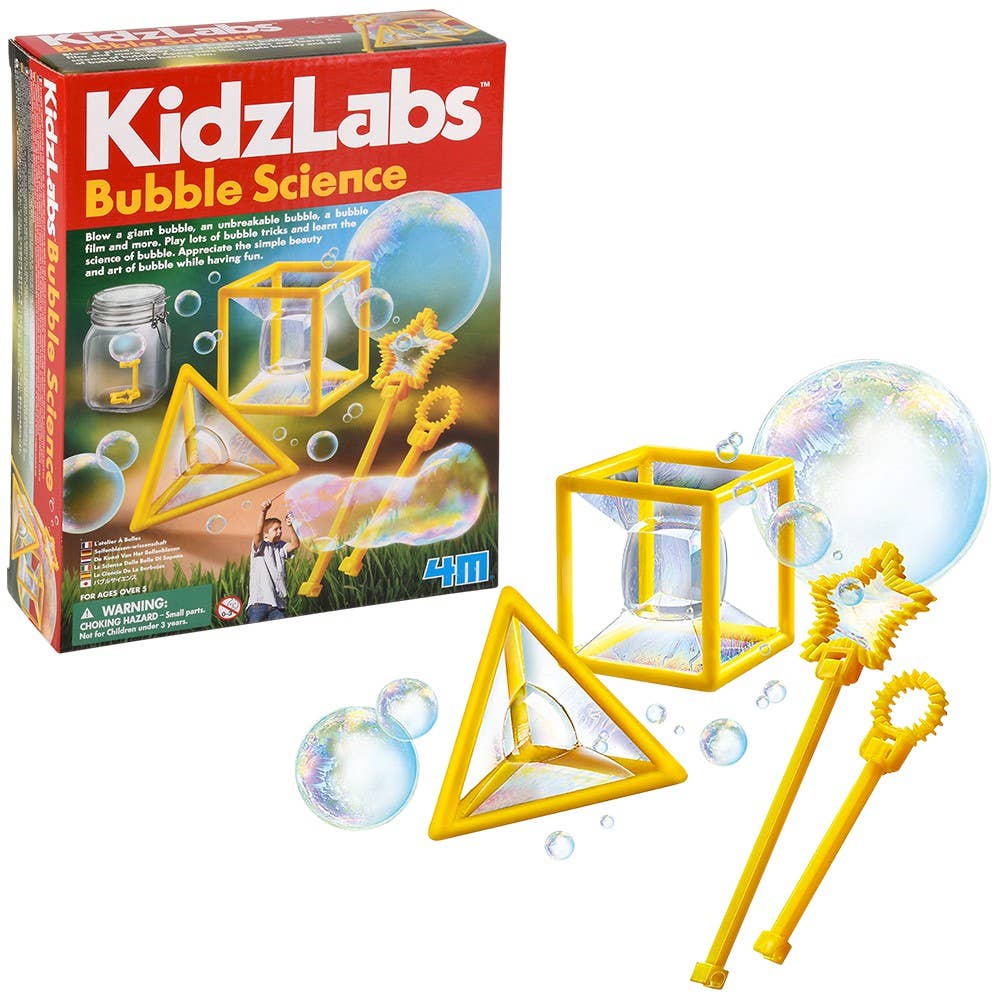 Blow different kinds of bubbles with KidzLabs - Bubble Science kit. It includes different bubble wands to make all kinds of shapes. Great for outdoor play. Each piece is in a color box.