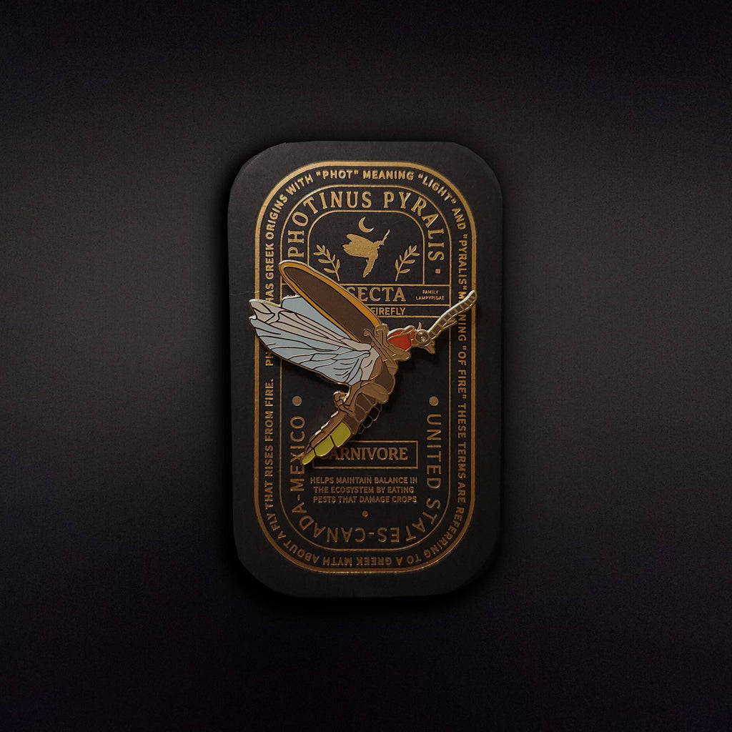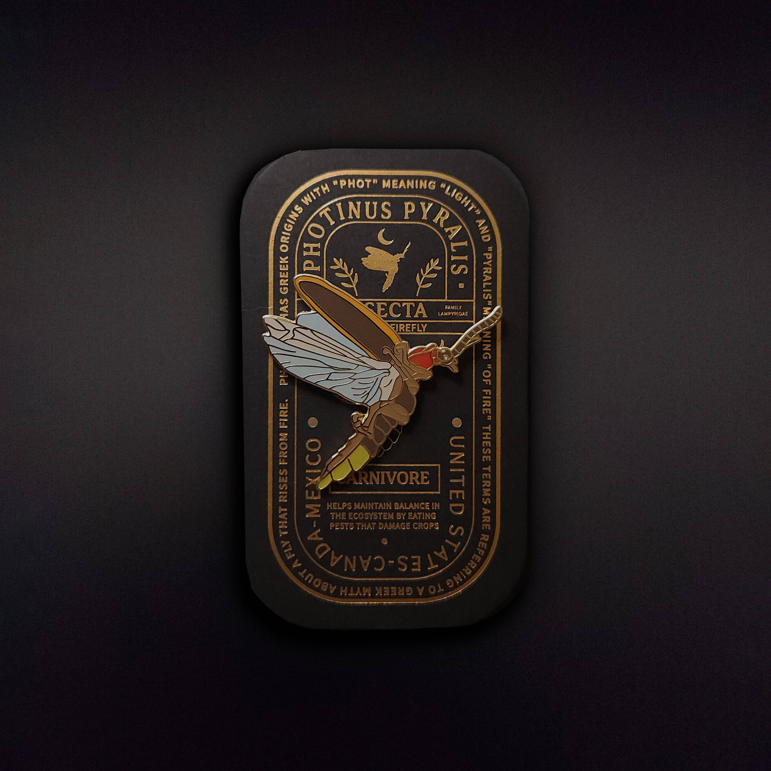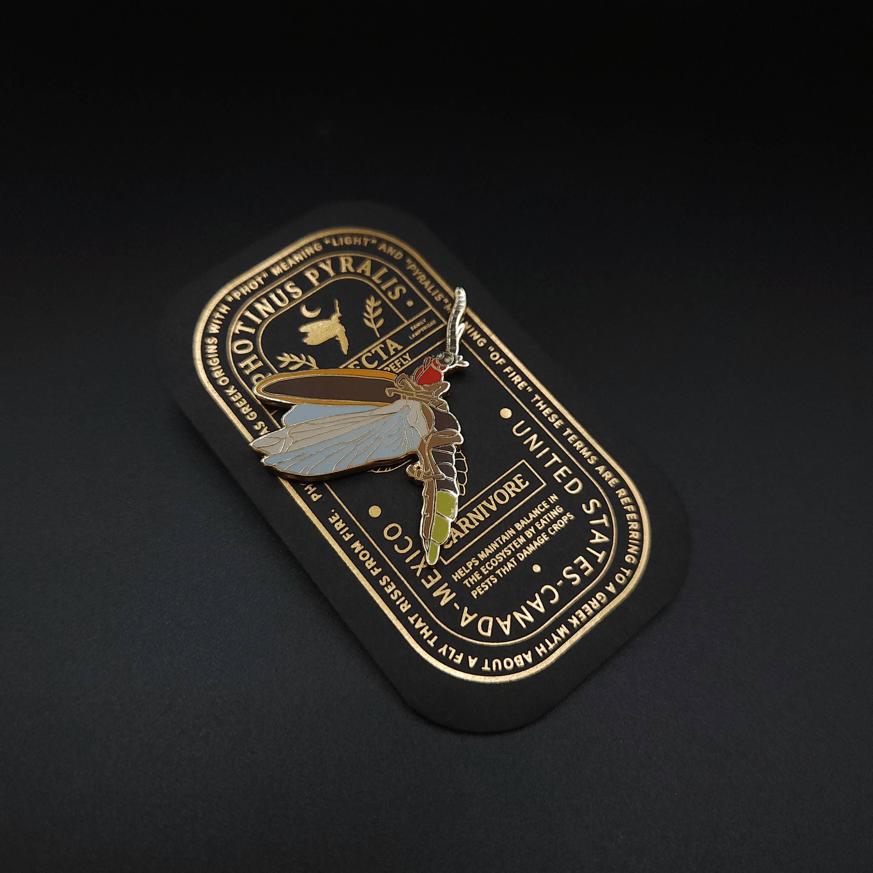 *This Pin Glows in the Dark!* Discover the enchanting world of the Eastern Firefly with our beautifully crafted hard enamel pin. This exquisite pin showcases the intricate details of this mysterious insect, making it a must-have for entomology enthusiasts and nature lovers. Product Details: Material: Gold-coated Zinc Alloy Size: 1.6" x .6" Backing: Rubber Pin Type: Hard Enamel Display Card: Black with Gold Foil Why You'll Love It: 🐛Artistic Beauty: Our Eastern Firefly hard enamel pin is a miniature work of art, capturing the essence of this fascinating insect with precision and elegance. 📖 Educational: The pin comes displayed on a striking black card adorned with gold foil detailing. You'll find a wealth of educational information about the Eastern Firefly. Learn about its origin, taxonomic ranks, and its role in the ecosystem. 🎁 Perfect Gift: This pin makes a thoughtful gift for anyone who appreciates the beauty and wonder of nature. It comes beautifully packaged