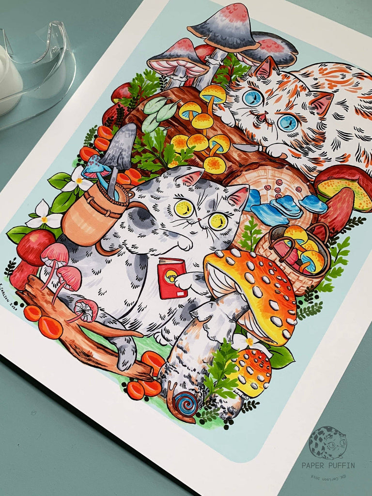 8x10” archival print of two curious cats foraging around a colorful terrain of mushrooms, little ferns and a curious snail friend. Original illustration drawn with Copic markers and ink, with a digitally added blue backdrop. This print is incredibly detailed and vibrant.
