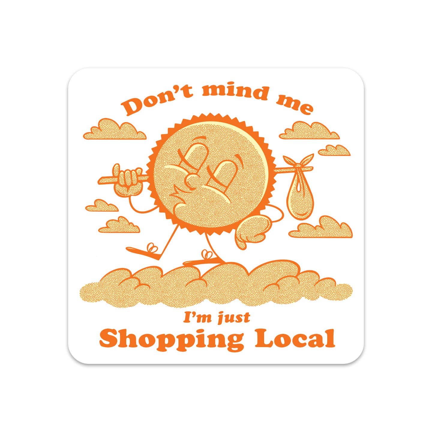 Sunny's here to remind you that the key to walking on sunshine is shopping local! 3" x 3" UV and weather-resistant Made in the USA.