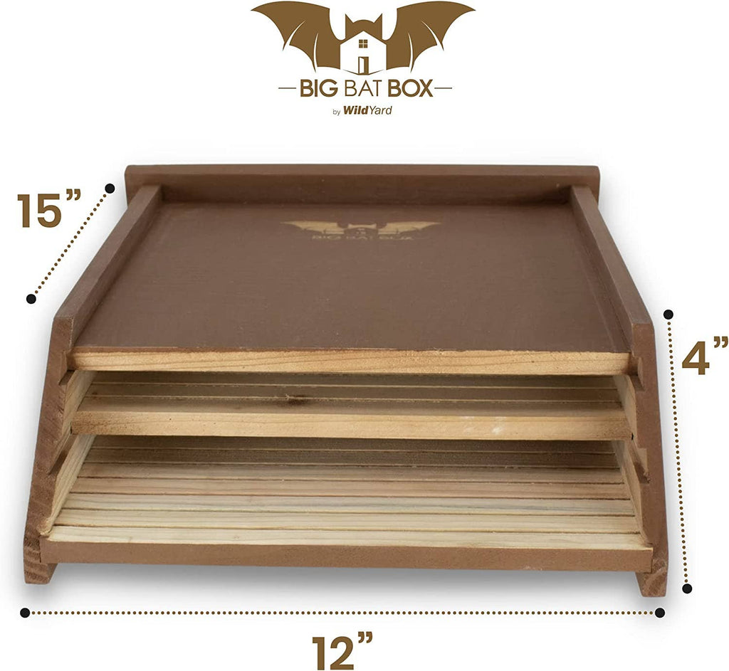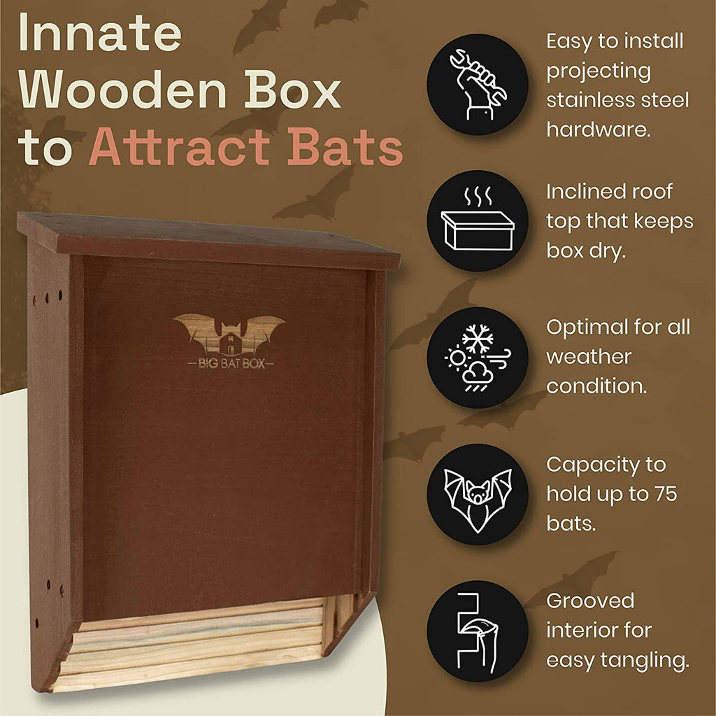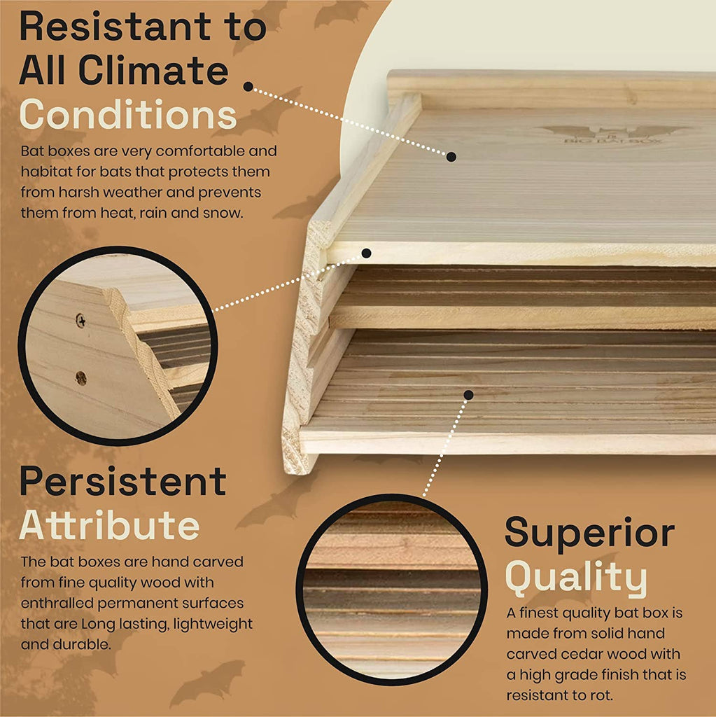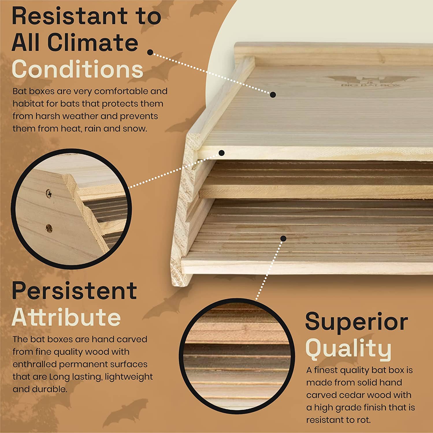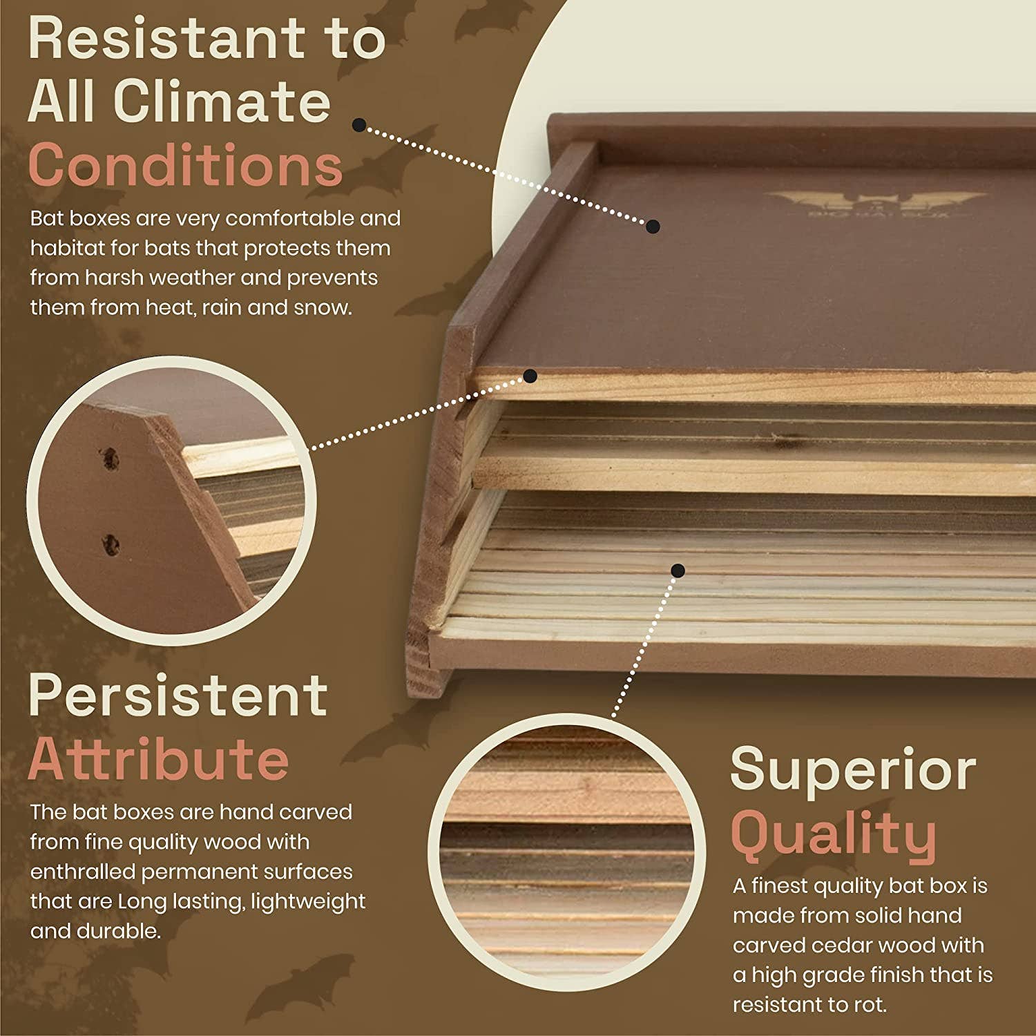 These bat boxes are hand-carved from high-quality Cedar wood and naturally resistant to water, making them ideal for all-weather. The two chambers offer optimal roosting space and excellent conditions for bats to live in. It can hold up to 75 bats, helping to eliminate insects from the backyard.