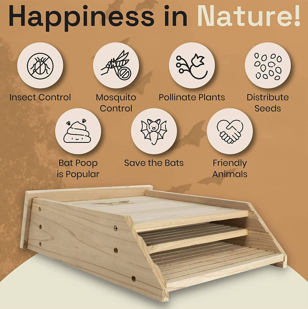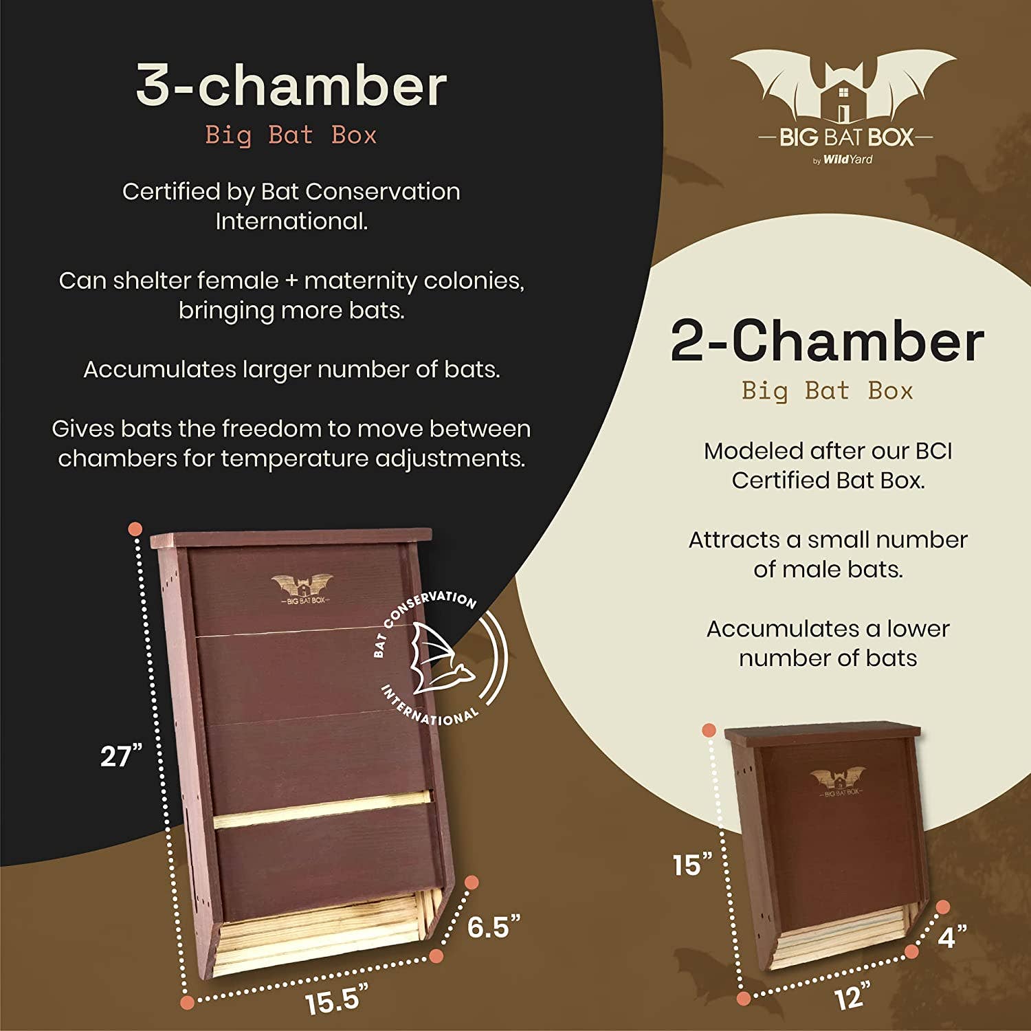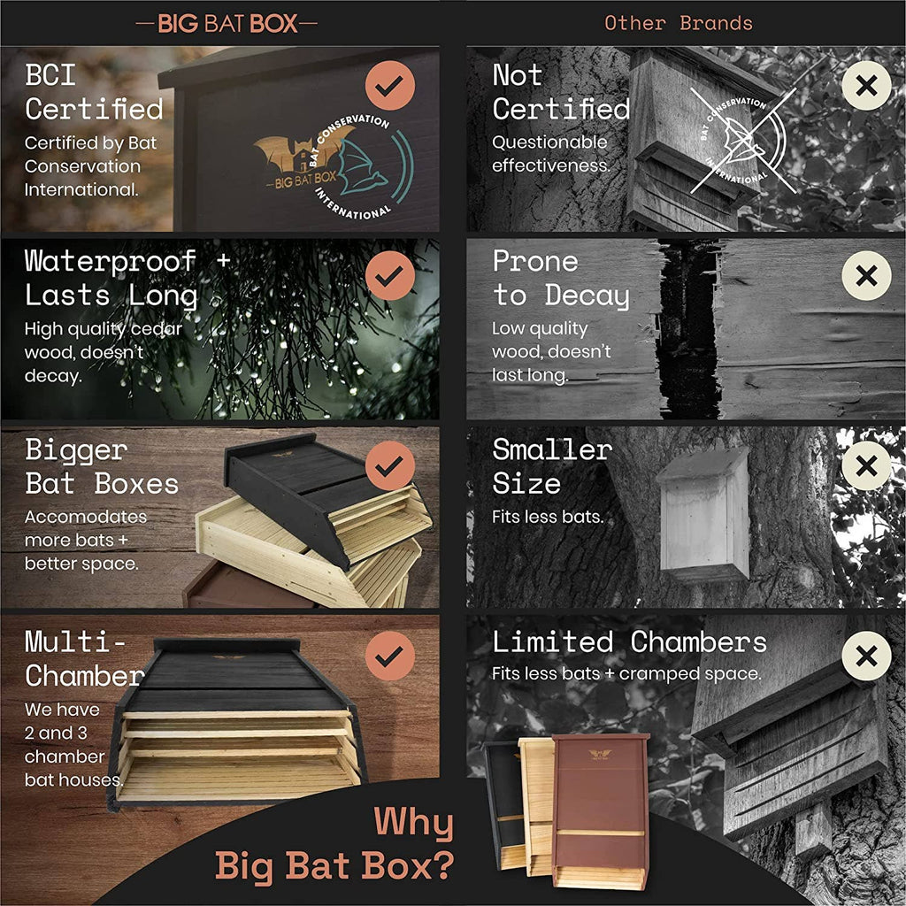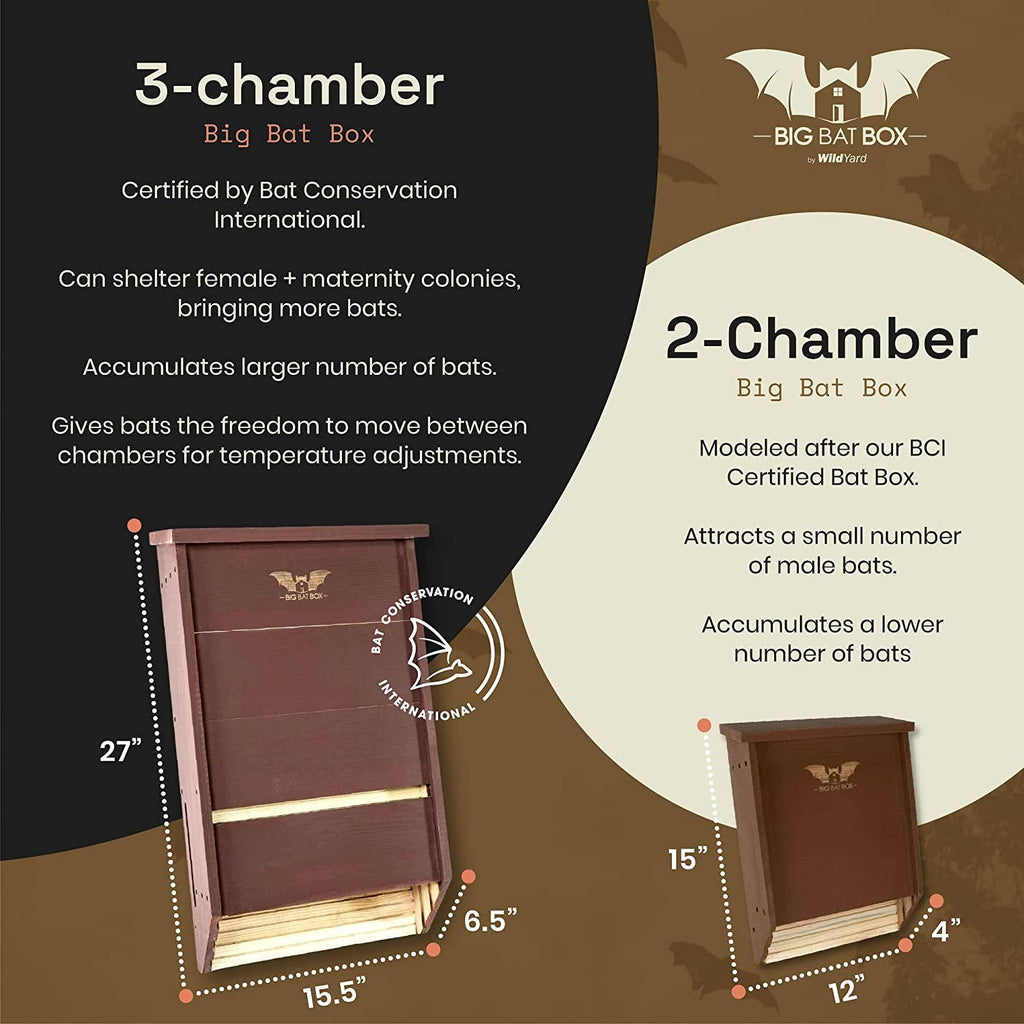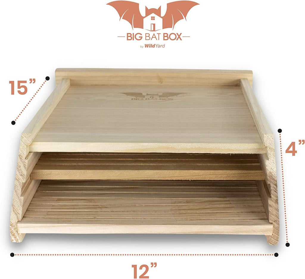 These bat boxes are hand-carved from high-quality Cedar wood and naturally resistant to water, making them ideal for all-weather. The two chambers offer optimal roosting space and excellent conditions for bats to live in. It can hold up to 75 bats, helping to eliminate insects from the backyard.