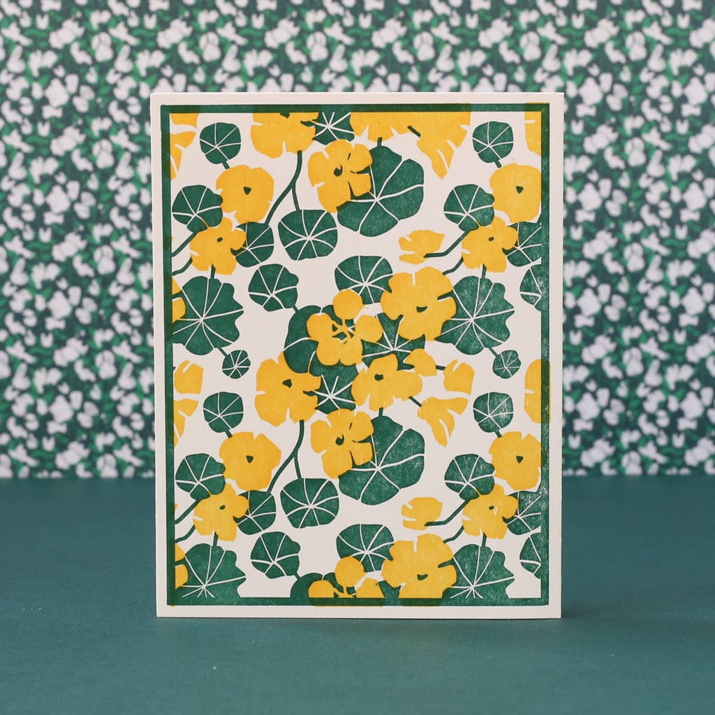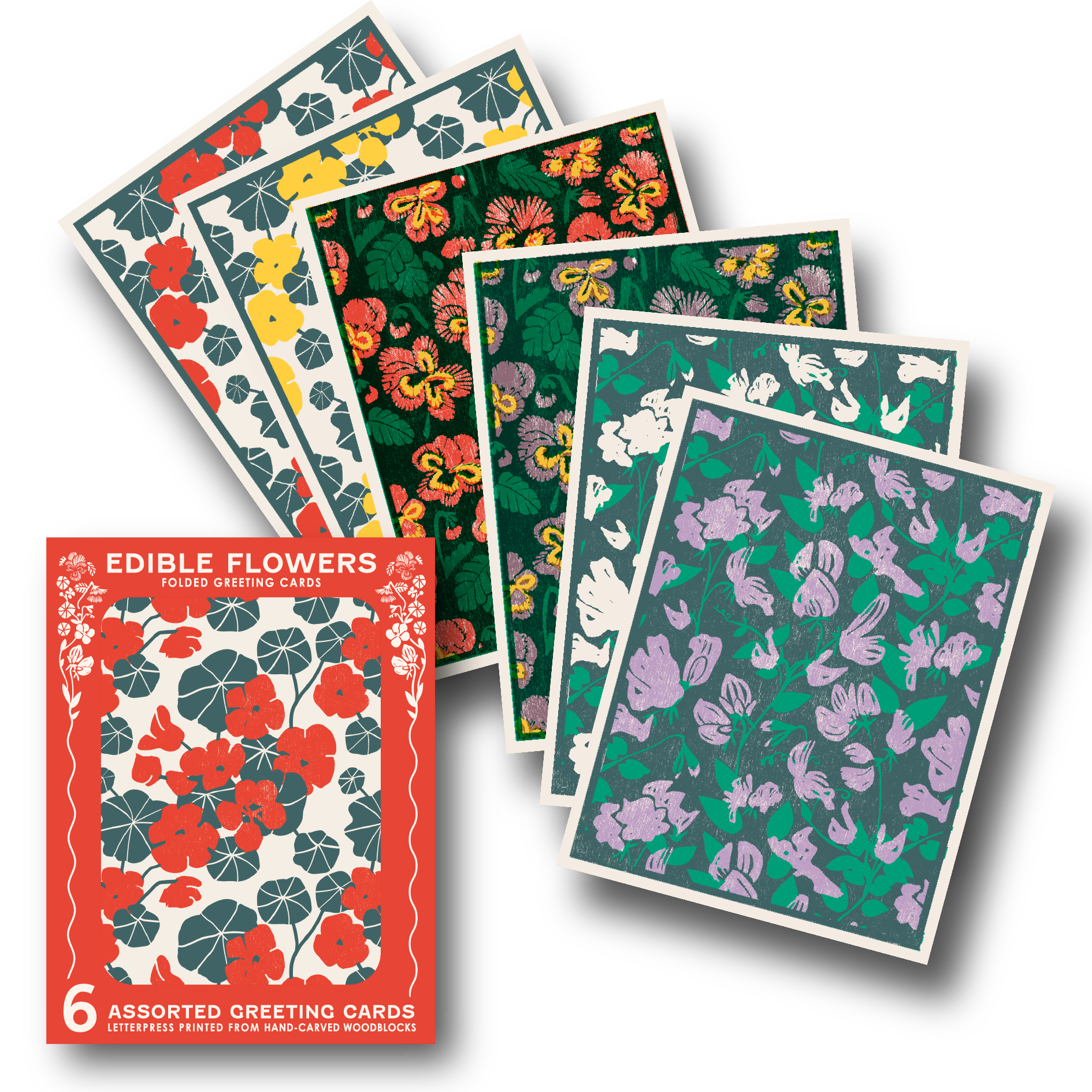 Letterpress printed from hand-carved woodblocks on 100% recycled paper. Includes matching envelopes inside of a branded boxed that can be repurposed.