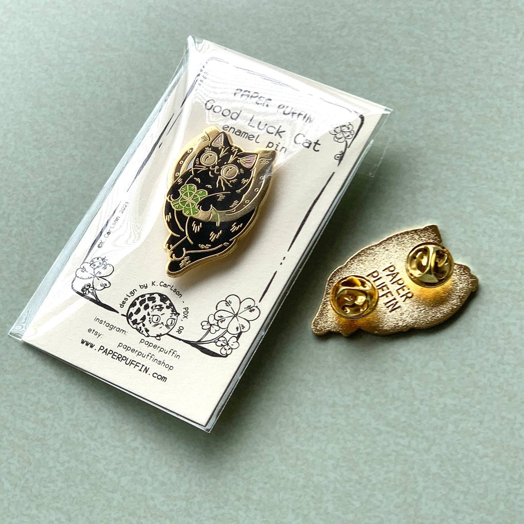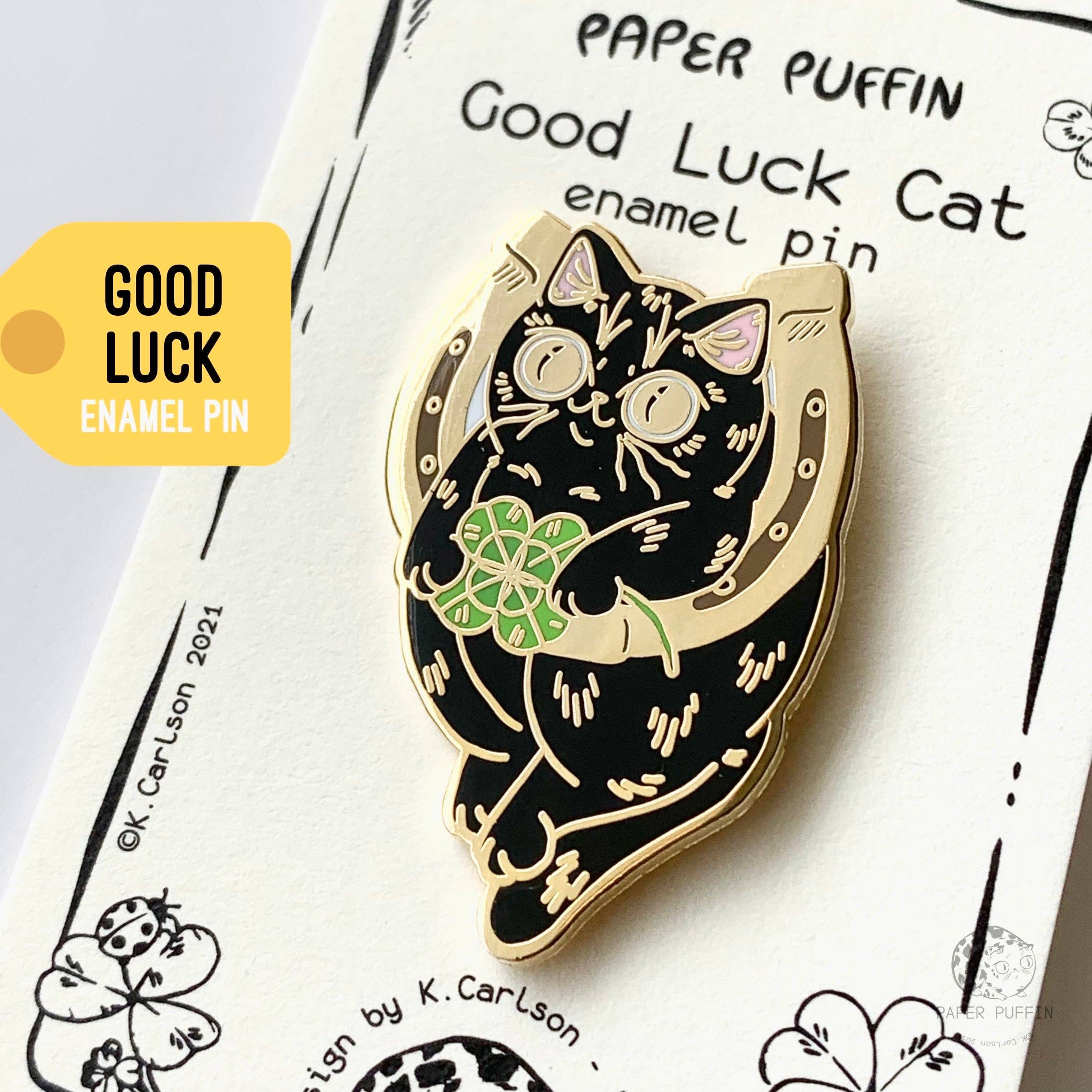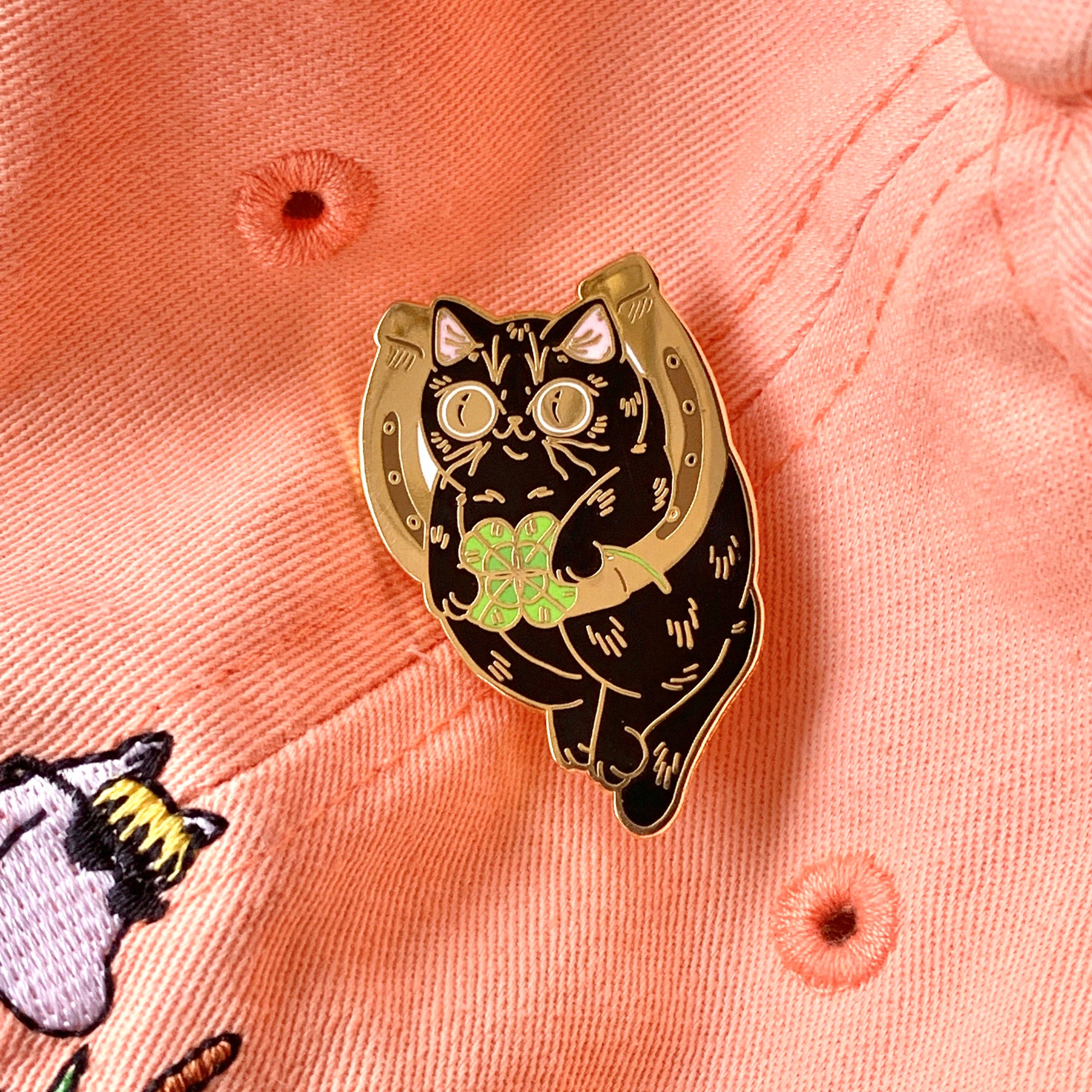 This listing is for an enamel pin of a smiling black cat with gold eyes, holding a four-leaf clover and hanging from a gold horseshoe. Sure to bring the wearer a bit of good luck.