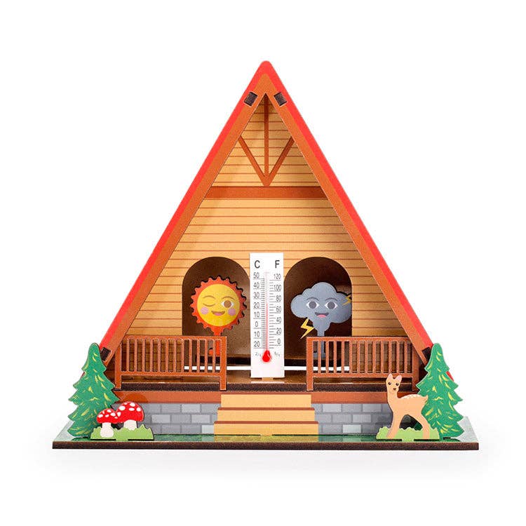 Inspired by the traditional Swiss Weather House, this DIY Weather House functions as a hygrometer that indicates weather conditions. The Sun pops out when the weather is sunny and dry. The Cloud pops out when the weather is rainy. Hang or place the weather house in an open space. Comes flat with 19 ready to assemble pieces. No batteries needed! , Design: KDT , Material: MDF, PP, paper, copper