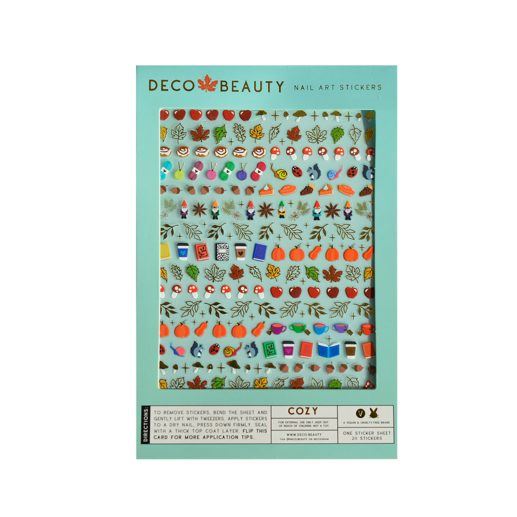 Nail art just got way easier. These tiny stickers were made to be easy to remove from their sheets and press right onto your nails. They can be applied to gelled, polishes, or natural nails, just make sure that whatever surface you're putting them on is dry. Oh, and don't be a hero; use tweezers to remove stickers from sheets. They are thin, so take your time and be gentle. Application directions and tips are printed on the back of packaging if you need additional guidance. For best results, use a thick top coat (Deco's Gel Effect Plumping Top Coat was specifically designed in mind for this job) to seal the sticker on your nail. You may need to put an extra coat overtop of gold metallic stickers. Sheet Keyword: acorn, fall, leaf, leaves, squirrel, book, coffee, tea, cinnamon bun, anise, pie, apple pie, pecan, snail, ladybug, gnome, pumpkin, mushroom, gold, autumn, thanksgiving, harvest