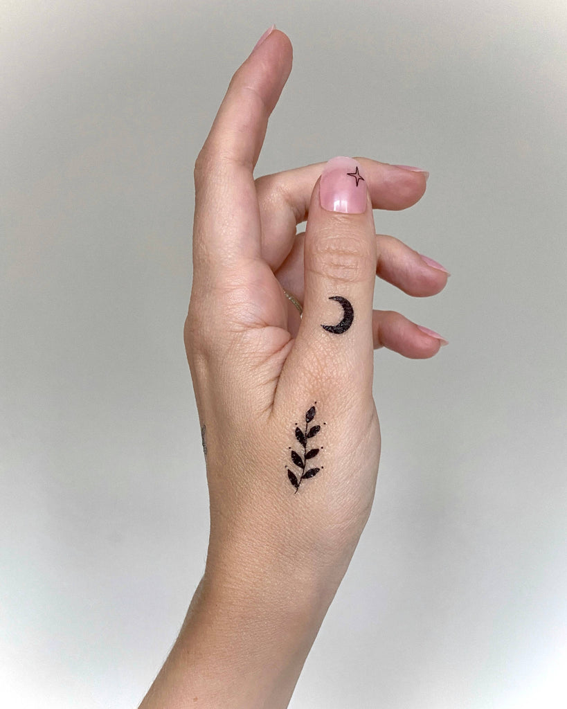 This tiny tat set includes a dragonfly (1.25"), butterfly (.75"), decorative eye, tiny snake, lighting bolt, sun, dark and light moons, dots, flowers and sparkles. The perfect set to wear as finger tats, nail tattoos, behind-the-ear tattoos, or tiny face tattoos!