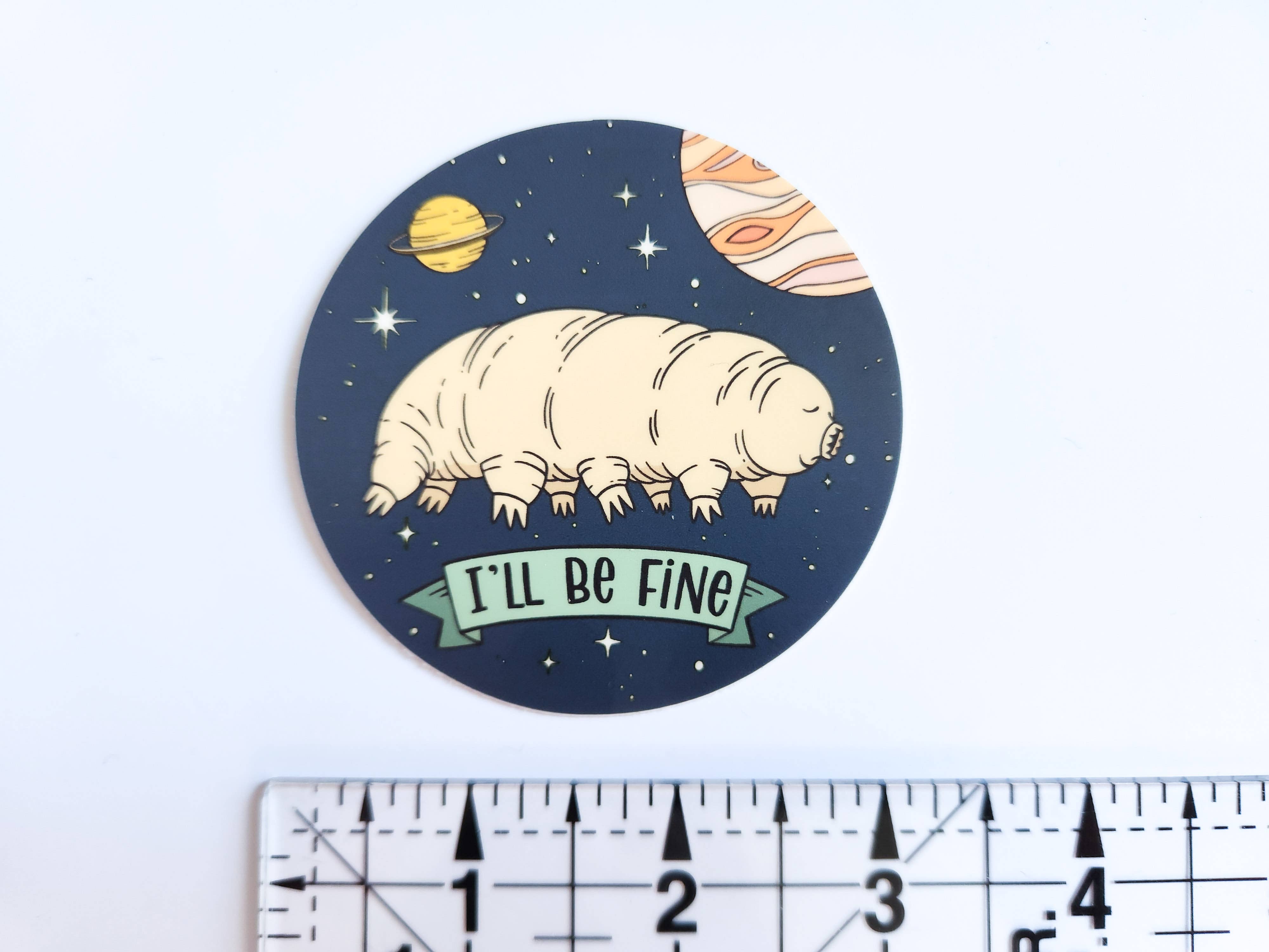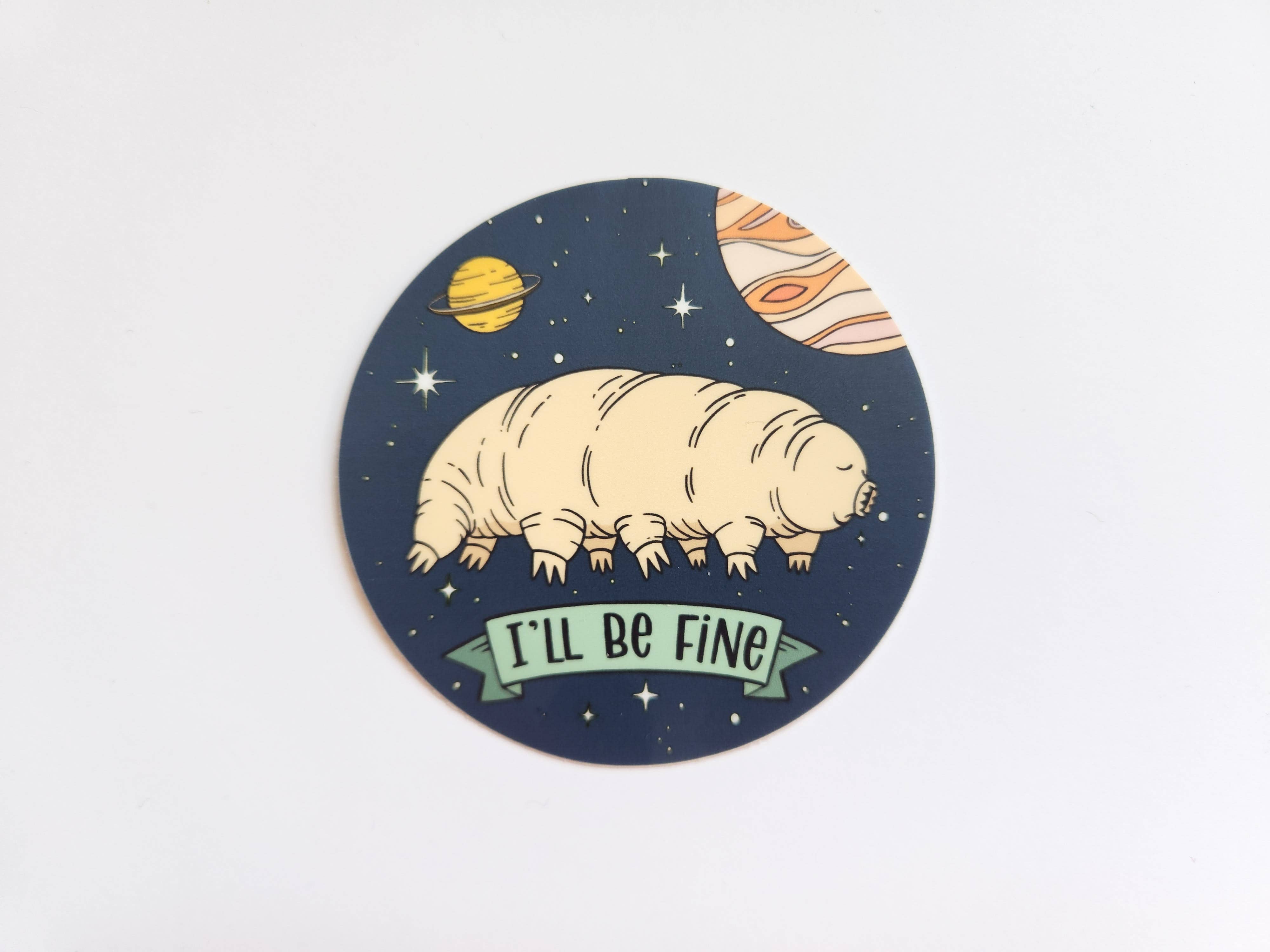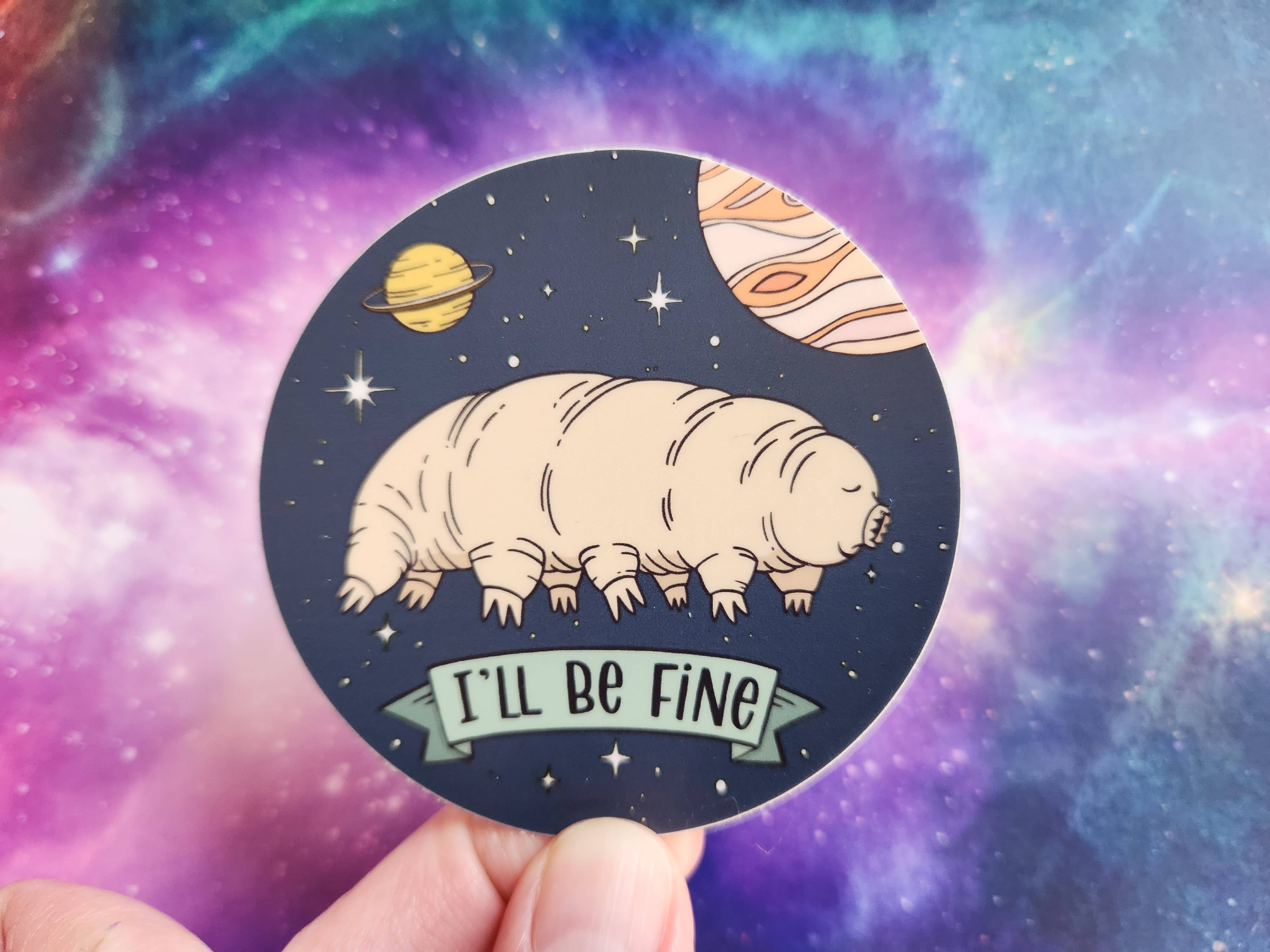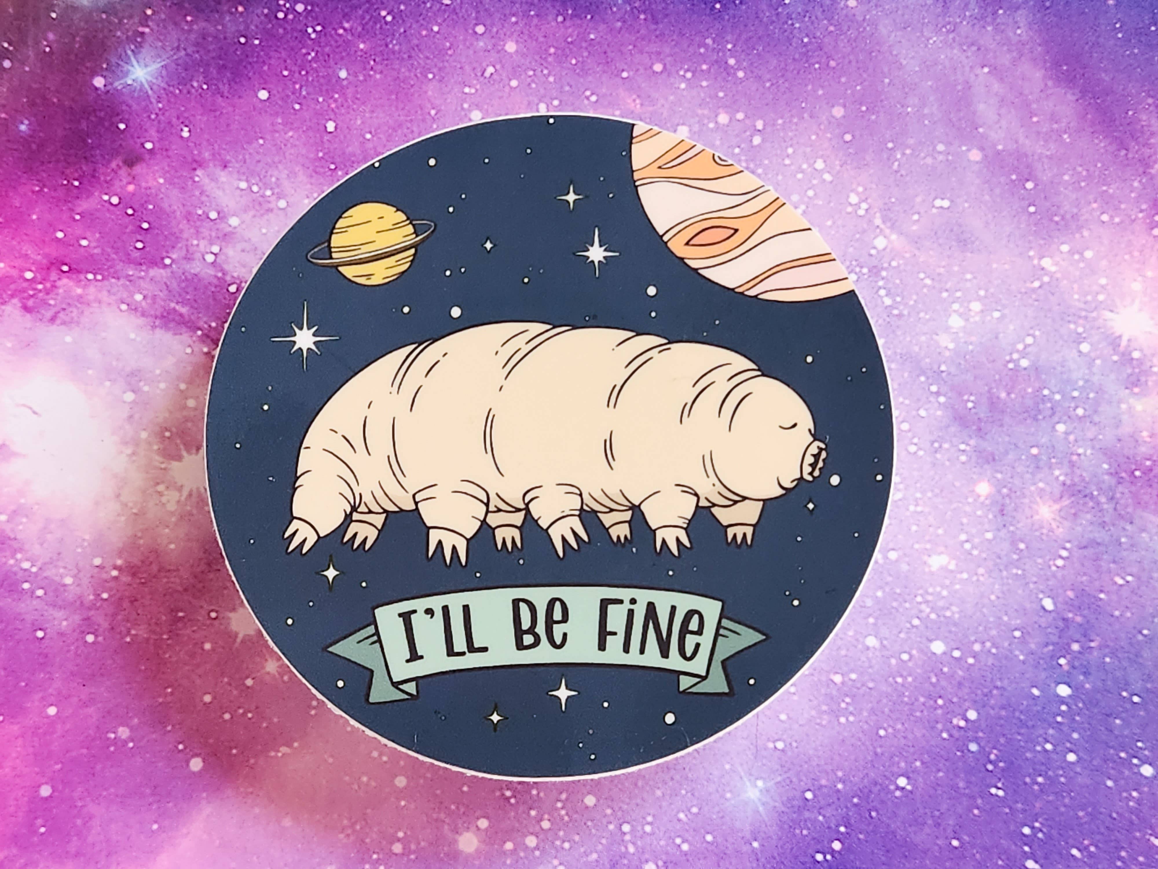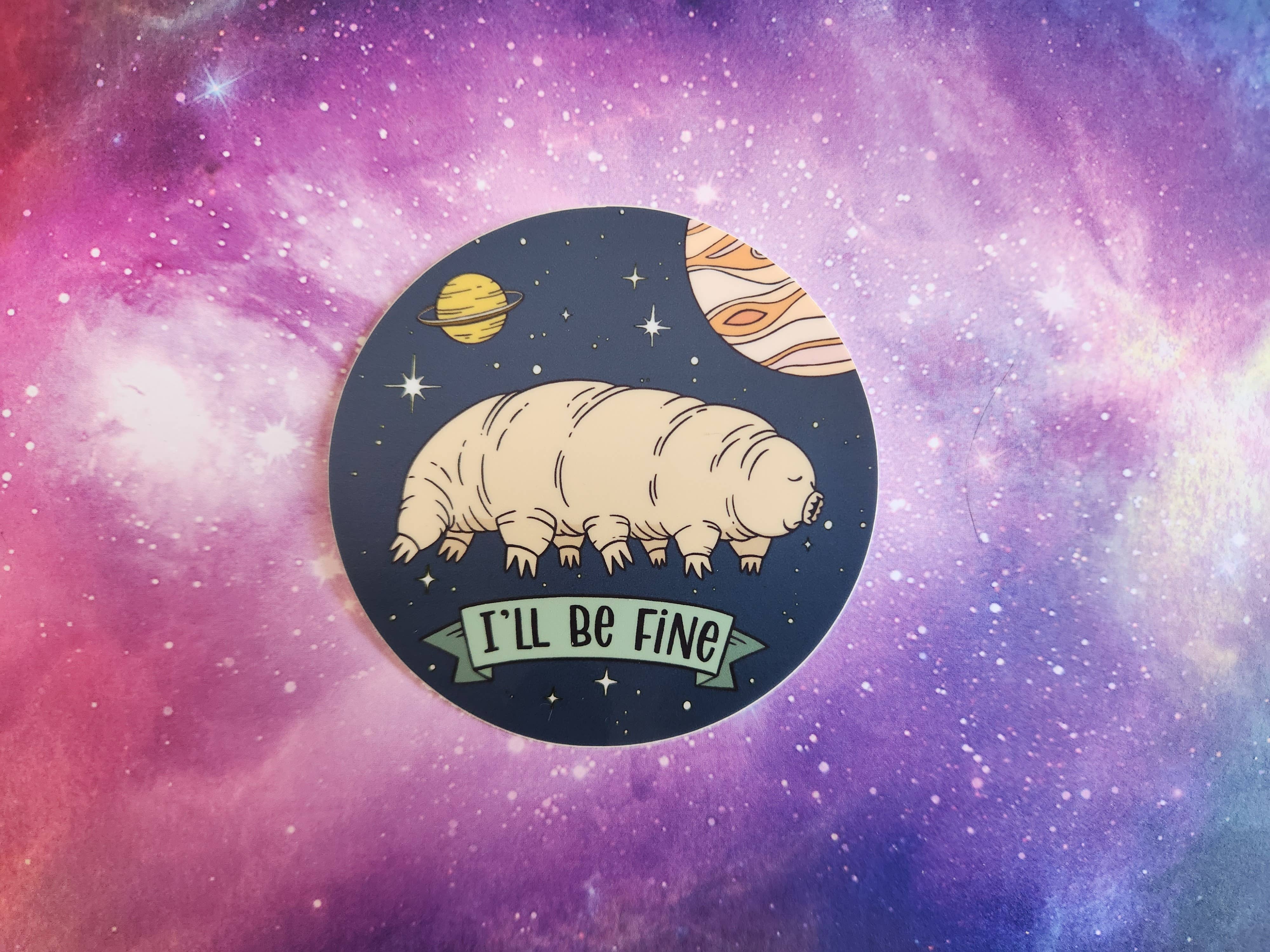 Tardigrades are microscopic creatures who are very resilient - they can go into a "tun" state that let's them survive very hostile environments (like outer space). The space tardigrade sticker is a 3 inch diameter circle. The sticker is made of a water resistant vinyl material that is very durable.