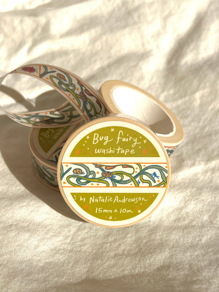 This washi tape features little bugs hidden in vines! Taken from the borders of my Bug Fairy print. This roll is 15mm wide x 10m of paper tape. Washi tape is super durable and flexible. It tears easily and can be safely applied to a variety of surfaces; it doesn’t leave a sticky residue behind, making it especially ideal for stationery and hanging prints temporarily.