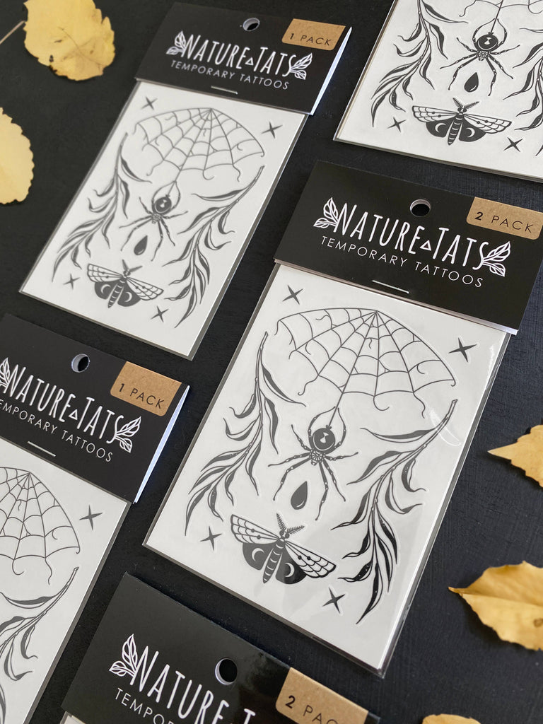 Our Widow & Willow temporary tattoo features a black widow spider gracefully descending from her web onto a moth, with a hint of blood and dark willow leaves adding a touch of nature's mystery. This original, hand-drawn design captures the beauty of nature’s darker side, making it a perfect choice for the spooky season or anytime you want to embrace a bit of gothic charm.